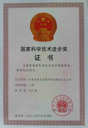 2013年1月18日,在國家科學技術(shù)大會上,由西安交通大學、陜西寶光真空電器股份有限公司、常熟開關制造有限公司、河南平高電器股份有限公司共同完成的《開關電器大容量開斷關鍵技術(shù)及應用》項目獲得2012年度國家科學技術(shù)進步獎二等獎,西安交通大學賈申利教授代表項目組到北京參加會議,并領取了國務院頒發(fā)的獲獎證書。